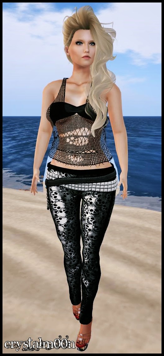 This daring outfit, consisting of a metallic pants with skulls, torn blouse network, and an internal bra, make you feel more daring, fierce and interesting of all the girls.
